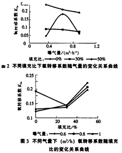 試驗表明:曝氣量和填充比同時影響著氧轉移系數(shù)。在無填料的情況下,曝氣量是主導因素:氧轉移系數(shù)隨著曝氣量的增加先增大而又減小。因為在低氣量的條件下,隨著氣體流量的增大,含氣率增大,相應地增大了氣液接觸面積;而當氣體流量增大到一定程度后,曝氣產生的氣泡直徑變大,上升速度快,氣泡更易于逃逸,使氧轉移系數(shù)降低。 在一定的填充比的情況下,一方面由于填料占據(jù)本來的一部分液體空間導致反應器內含氣率下降,另一方面由于填料切割氣泡的作用使氣泡直徑變小而增大轉移系數(shù)。從圖中可以看出,在氣量為