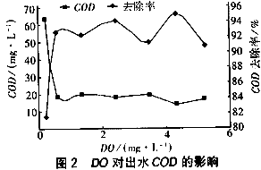 試驗結(jié)果表明:當(dāng)DO>1 mg/L時對COD有良好的去除效果,其去除率可達90%以上,且DO再增加對COD的去除效果不再有明顯影響。在短期缺氧條件下,即DO在0.5~1 mg/L時系統(tǒng)也能獲得較好的去除效率。但是嚴(yán)重缺氧時間較長,如DO<0.5 mg /L時膜出水會出現(xiàn)異味,