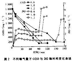 為了實現以DO作為SBR法運行過程中曝氣量及反應時間的模糊控制參數,必須尋找DO與有機物降解之間的規律性。因此,本試驗在兩種不同條件下研究DO濃度對反應過程的影響。2.1 同一進水濃度不同曝氣量 試驗配制原水COD濃度為1800mg/L,進水混合后反應初始COD濃度為1600mg/L。反應過程平均MLSS=2000 mg/L,曝氣量分別為