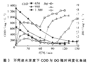 從圖中可以看出,反應開始8~10min左右,不同曝氣量下DO值顯著不同。曝氣量越小,此時的DO值越低,致使整個反應過程DO處于較低水平,大大延長了反應時間。隨著曝氣量的增大,初始DO值也在增大,帶來整個反應過程DO的提高,縮短了有機物達到難降解程度的時間,即減少了反應時間。但是,過分地增大曝氣量,初始DO的過高會造成整個過程DO處于過高的水平,卻不能有效地縮短反應時間,還造成能量的巨大浪費。產生這種現象可以從耗氧速率與DO的相關關系的研究中得到解釋,因為在低DO濃度下,DO濃度對生化反應速率的影響較大。當DO在1~2mg/L范圍內,隨著DO的提高,耗氧速率大幅度提高,標志著有機物降解速率的加快,從而縮短反應時間。當DO超過2mg/L后,繼續增大DO值,由于受污泥濃度(MLSS)的限制,有機物降解速率的增加幅度較小。? 取進水COD濃度分別為400、600、800、1000、1