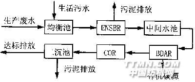 3 ENSBR/BDAR/COR處理工藝技術(shù)特點(diǎn) (1)整個(gè)系統(tǒng)污泥不回流,一方面保證了各類(lèi)微生物長(zhǎng)期在最佳環(huán)境條件下生存,因而微生物活躍、新陳代謝旺盛、降解有機(jī)物能力強(qiáng);另一方面,降低了能耗,提高了處理裝置有效利用率。 (2)處理水在ENSBR停留時(shí)間長(zhǎng),HRT>20 h,確保了該廢水生物硝化反應(yīng)良好進(jìn)行。 (3)各反應(yīng)器污泥濃度高,能夠富集大量的微生物,降低污泥負(fù)荷,使生物硝化和反硝化反應(yīng)得以順