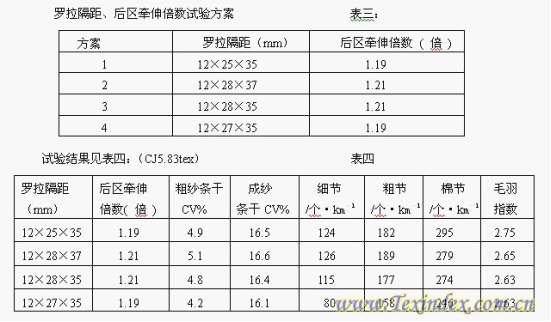 為了合理優(yōu)選出最佳粗紗工藝參數(shù),以提高CJ5.83tex成紗質(zhì)量。我們根據(jù)確定的試驗(yàn)條件,對(duì)FA497粗紗的總牽伸倍數(shù)、主牽伸區(qū)和后區(qū)的羅拉隔距、后區(qū)牽伸倍數(shù)、加壓重量及鉗口隔距進(jìn)行工藝優(yōu)選試驗(yàn).