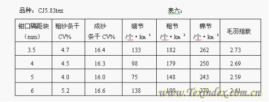 粗紗鉗口隔距,根據(jù)粗紗定量及主牽伸倍數(shù)而定,定量輕而主牽伸倍數(shù)較低時(shí),膠圈鉗口內(nèi)通過(guò)的纖維量大,鉗口應(yīng)偏大掌握,反之偏小掌握。不同粗紗鉗口隔距優(yōu)選試驗(yàn)及結(jié)果見(jiàn)表六。