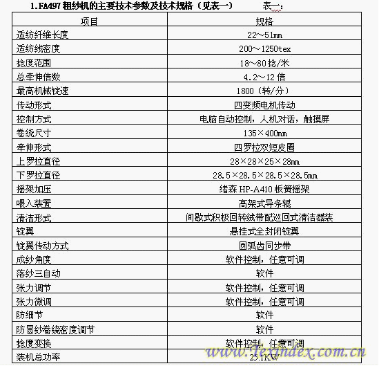 FA497粗紗機(jī)是中意合資·賽特環(huán)球機(jī)械有限公司生產(chǎn)的新型高速懸錠電腦粗紗機(jī),它采用先進(jìn)的電腦控制技術(shù),取掉了原有粗紗機(jī)的鐵炮變速機(jī)構(gòu)、機(jī)械成形機(jī)構(gòu),采用進(jìn)口變頻器,實(shí)現(xiàn)無(wú)極變速。四個(gè)變頻電機(jī)分別驅(qū)動(dòng)錠翼、羅拉、卷繞、升降系統(tǒng),運(yùn)用成熟的計(jì)算機(jī)控制技術(shù),實(shí)現(xiàn)了四大運(yùn)動(dòng)系統(tǒng)的同步匹配;配備懸掛式全封閉高速錠翼,最高機(jī)械錠速達(dá)1800轉(zhuǎn)/分,是目前國(guó)內(nèi)較先進(jìn)的高速懸錠電腦粗紗機(jī)。