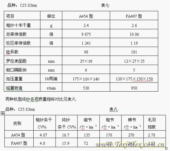 FA497粗紗機(jī)的總牽伸倍數(shù)、后區(qū)牽伸倍數(shù)、羅拉隔距、搖架加壓重量、前區(qū)鉗口隔距等各項(xiàng)工藝參數(shù)經(jīng)過(guò)優(yōu)選后,CJ5.83tex紡紗質(zhì)量的到明顯提高,表七為與原A454粗紗機(jī)工藝比較。