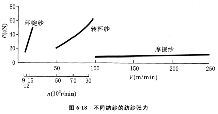 (2)低張力紡紗。摩擦紡的紡紗速度為環(huán)錠紡的10—25倍,轉(zhuǎn)杯紡的2.5倍,但紡紗張力只有環(huán)錠紡的20%,轉(zhuǎn)杯紡的14%,如圖6—18所示,這導(dǎo)致纖維在紡紗過程中內(nèi)外轉(zhuǎn)移困難,纖維伸直少,毛羽多。