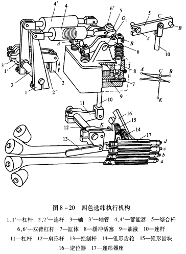 生產中四色選緯機構使用較多,圖8—20是四色選緯的執行機構,選緯動作由多臂機的最后兩頁綜框連桿驅動,選緯的信號裝置占用了多臂機信號裝置的一個部分,所使用的多臂機可以是計算機控制的、光電控制的或由紋板紙、探針、花筒機械控制的。