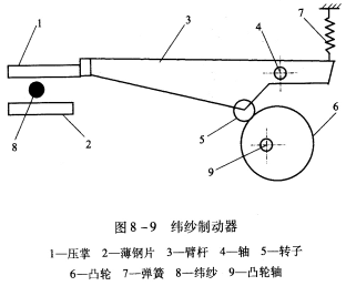 緯紗制動器的結構示意圖如圖8—9所示,它由瓷質的壓掌1與一片厚度為0.04~0.07mm的拋光薄鋼片2組成,緯紗8在壓掌與薄鋼片2之間通過。根據壓掌1對薄鋼片2的壓緊程度,使紗線在壓掌表面與薄鋼片之間產生不同的摩擦力。壓掌1固裝在臂桿3上,臂桿以軸4為擺動中心,它的下臂端裝有轉子5,依靠彈簧7的作用使轉子與裝在凸輪軸9上的凸輪6相接觸。當凸輪回轉時,壓掌就做上下擺動,壓掌與薄鋼片的接觸程度就發(fā)生變化,從而控制對緯紗的制動作用。