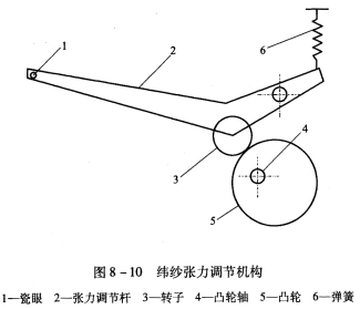 圖8—10是緯紗張力調節(jié)機構簡圖,在張力調節(jié)桿2的頂端有瓷眼1,緯紗從瓷眼中穿過。由于彈簧6的拉力,使張力調節(jié)桿2上的轉子3與凸輪5接觸,凸輪5的回轉使張力調節(jié)桿2上下擺動。凸輪軸4與圖8—9中的凸輪軸9相同。