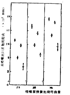 圖1所示在雙噴踞兩緯換噴的織機(jī)上(幅~150cm,車速42O轉(zhuǎn)/分),噴射泵彈簧的初彎曲量在三個階段里變化的情況下,從噴咀里噴射出的水速為34.8米/紗時,測出的緯絲頭部位置的結(jié)果。圖中縱座標(biāo)表示離開噴咀頭部的距離。在各個初期彎曲量中,4個“0符號