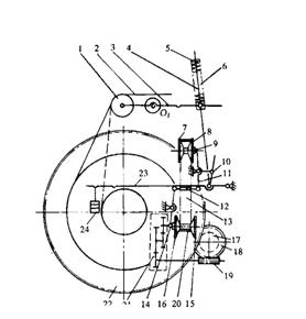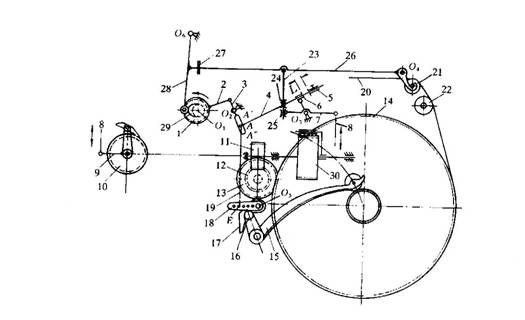 1-偏心盤(pán)? 2-外殼? 3-擺桿? 4-拉桿? 5-擋圈? 6-擋塊? 7-三臂桿? 8-小拉桿? 9-雙臂撐桿? 10-棘輪? 11-蝸桿? 12-蝸輪? 13-齒輪? 14-織軸邊盤(pán)齒輪? 15-轉(zhuǎn)臂? 16-轉(zhuǎn)子? 17-雙曲線(xiàn)凸輪板? 18-調(diào)節(jié)轉(zhuǎn)臂19-連桿? 20-經(jīng)紗? 21-活動(dòng)后粱? 22-固定后粱? 23-調(diào)節(jié)桿? 24-擋圈? 25-擋塊? 26-扇形張力桿? 27-制動(dòng)器? 28-制動(dòng)桿? 29-開(kāi)放凸輪