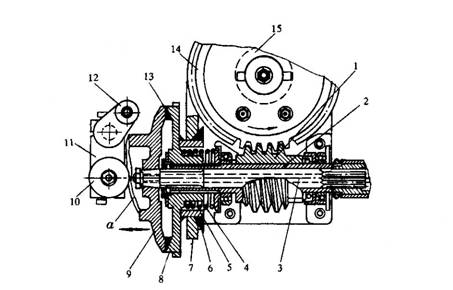 12-連桿? 13-摩擦環(huán)? 14-蝸輪? 15-送經(jīng)齒輪? a-主動(dòng)摩擦盤(pán)凸輪面