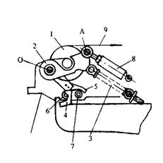 1-后梁? 2-擺臂? 3-擺桿? 4-擺軸? 5-螺釘? 6-連桿? 7-弧形桿? 8-支持軸