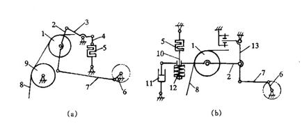 在圖10-12中,當(dāng)經(jīng)紗張力由于某種隨機(jī)原因而增大時(shí),經(jīng)紗迫使裝有后梁1的擺臂2繞擺軸4作逆時(shí)針轉(zhuǎn)動(dòng),通過(guò)擺桿3使連桿6上升。連桿6的一端與弧形桿7鉸接,弧形桿上有一圓弧槽,其圓弧中心向上偏離支持軸8的軸心,因此圓弧上端到支持軸軸心的距離大,圓弧下端到軸心的距離小。連桿6上升時(shí),弧形桿7上的圓弧槽繞支持軸8作順時(shí)針轉(zhuǎn)動(dòng),支持軸和圓弧槽中滑塊10的距離增大。由于滑塊芯軸9固定不動(dòng),因此支持軸向左移動(dòng),通過(guò)連桿11,帶動(dòng)轉(zhuǎn)子桿13、轉(zhuǎn)子14繞機(jī)架上的轉(zhuǎn)子桿軸12作逆時(shí)針?lè)较蜣D(zhuǎn)動(dòng),使轉(zhuǎn)子與主動(dòng)摩擦盤(pán)的凸輪面距離縮小,送經(jīng)量增加。送經(jīng)量的增加促使經(jīng)紗張力逐漸回復(fù)到正常數(shù)值,后梁也回歸到正常的平衡位置。相反,當(dāng)經(jīng)紗張力因某種因素而減小時(shí),機(jī)構(gòu)動(dòng)作相反,送經(jīng)量減小,并逐漸回復(fù)到正常數(shù)值,后梁也回到正常位置。