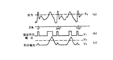 圖10-16表示了經(jīng)紗張力采集、處理和控制原理。當(dāng)經(jīng)紗張力大于預(yù)定數(shù)值F0時(shí),見(jiàn)圖10-17(a)中虛線(xiàn)所示,鐵片對(duì)接近開(kāi)關(guān)的遮蓋程度達(dá)到使振蕩回路停振,于是開(kāi)關(guān)電路輸出信號(hào)V1,見(jiàn)圖10-17(b)所示。F0的數(shù)值由調(diào)整張力彈簧剛度和接近開(kāi)關(guān)安裝位置來(lái)設(shè)定。信號(hào)V1經(jīng)積分電路、比較電路處理,如圖10-17(c)所示。當(dāng)積分電壓V2高于設(shè)定電壓V0,則輸出信號(hào)(V2-V0)通過(guò)驅(qū)動(dòng)電路使直流送經(jīng)伺服電動(dòng)機(jī)轉(zhuǎn)動(dòng),織軸放出經(jīng)紗。輸出信號(hào)(V2-V0)越大,電動(dòng)機(jī)轉(zhuǎn)速越高,經(jīng)紗放出速度越快。當(dāng)V2<V0時(shí),電動(dòng)機(jī)不轉(zhuǎn)動(dòng),織軸被鎖定,經(jīng)紗不能放出。