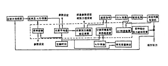 后梁受力檢測(cè)方式的經(jīng)紗張力信號(hào)處理與控制系統(tǒng)中采用了微電腦。該方式應(yīng)用在不同電子式送經(jīng)機(jī)構(gòu)中,信號(hào)處理和控制的方法各有特點(diǎn),所使用的織軸驅(qū)動(dòng)伺服電動(dòng)機(jī)也有交流和直流之分,因此,經(jīng)紗張力信號(hào)的處理