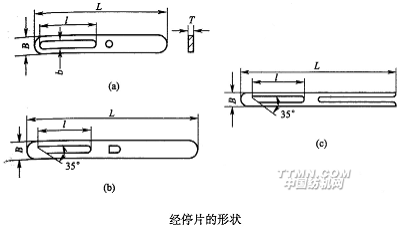 經停片是織機經停裝置的傳感元件,當經紗斷頭時,經停片下落,通過機械檢測機構或電氣檢測機構,發動織機迅速停車。經停片由鋼片制成,外形如下頁圖所示,圖中(a)為機械式經停裝置的經停片,(b)、(c)為電氣式經停裝置的經停片。