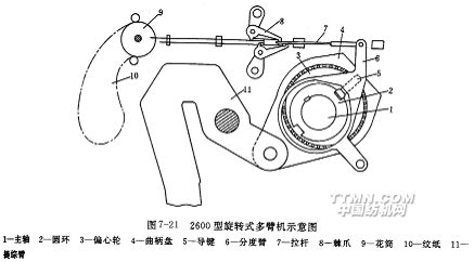按提綜裝置的結構不同,多臂開口機構又可分成拉刀拉鉤式和回轉式兩類。前者歷史悠久,但機構復雜,較難適應高速運轉;后者采用回轉偏心盤原理,機構簡單,適合高速。
