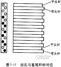 紋板的結構如圖7-17所示,每塊紋板上有兩列紋釘孔,呈錯開排列,第一、二列紋孔分別對準彎頭重尾桿和平頭重尾桿。每列紋孔控制一次開口,紋板的紋孔列數應為組織循環緯紗數的整數倍,如果組織循環緯紗數為奇數,則應乘上一個偶數,以得到整數塊紋板。此外,因為花筒是八角形的,紋板的總數應不小于8塊(16緯)。