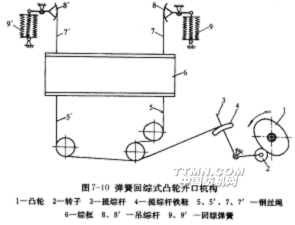 這種開口機構中,綜框下降是受凸輪驅動的,而綜框上升則依靠彈簧的恢復力,因此也是消極式凸輪開口。彈簧恢復力的調節通過增減彈簧根數來完成,根據織物品種不同,綜框每側可選擇7~15根拉伸彈簧。這種形式的開口機構最高響應的織機轉速可達1000r/min。各頁綜框的開口凸輪可以互換。改變鐵鞋在提綜桿上
