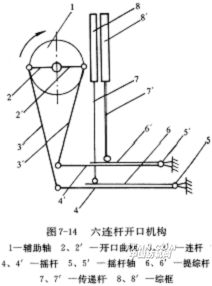 凸輪開口機構能按照優化的綜框運動規律進行設計,所以工藝性能好,但凸輪容易磨損,制造成本高,因此在織制簡單的平紋織物時,尚需尋求更為簡單的高速開口機構。連桿開口機構就能滿足這種需要。