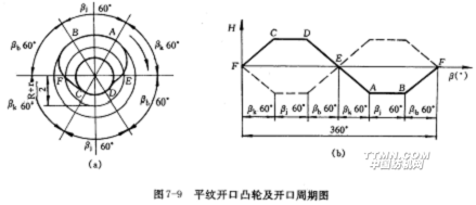 圖7-9(a)是平紋凸輪,它的外緣輪廓由若干段弧線所圍成,這些弧線分別對應開口、靜止和閉合三個階段。其中大半徑圓弧線AB和小半徑圓弧線CD對應綜框(經紗)在下方和上方形成開口過程中的靜止階段,稱為靜止弧線;連接大、小半徑圓弧的弧線AD和BC使綜框(經紗)由上方位置過渡到下方位置和由下方位置過渡到上方位置,前者稱下降弧線,后者稱上升弧線。在下降弧線和上升弧線上必有兩點E和F,在這里,運動綜框上下平齊,處于綜平位置。這就表明,凸輪每一回轉,受它控制的一組經紗便依次經歷上方靜止(CD弧線)、閉合(DE弧線)、綜平(E)、開口(EA弧線)、下方靜上(AB弧線)、閉合(BF弧線)、綜平(F)、開口(FC弧線)、又回到上方靜止的變化,完成兩次開口動作。用開口周期圖表示,如圖7-9(b)中的實線所示。受另一凸輪控制的另一組經紗的運動情況如圖中的虛線所示。