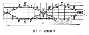 梭口沿緯向被分成m個單元,每個單元由一組綜框構成。在織制平紋織物時,一組綜框為兩頁,它們由一對開口凸輪1、2控制。在傳動軸3上安裝控制各組綜框的凸輪時,相鄰兩對之間保持相位差α。于是織機運動過程中綜框運動構成了如圖7-29所示的波形梭口。圖中畫出了一個基本的全波波形,它的長度為2L,它由K組運動規律相同但初相位不等的綜框形成,相鄰兩組綜框運動的相位差:
