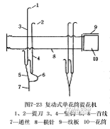 圖7-22是單動式提花開口的簡圖。所謂單動式是指提花開口機構的刀箱8在主軸一回轉內,上、下往復運動一次,形成一次梭口。