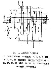 如圖7-24所示,1、2為交替運動的上、下刀箱,與刀箱相配的雙鉤豎針20、21、22、23直立在柵板24上,與控制雙鉤豎針的橫針16、17、18、19上的兩彎頭相配。橫針后端由彈簧作用使豎針復位,在橫針的前端有輔助橫針8、9、10、11,分別與探針4、5、6、7對應,12、13、14、15為橫針推刀箱的推刀。織機主軸一轉,紋板紙3便沿著花筒上的箭頭方向轉過一塊