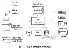 圖7-27是電子提花的花型設計和紋板制備系統的框圖,由圖案輸入、處理和紋板數據輸出等三部分組成。由于提花圖案較為復雜,系統提供了四種輸入手段。如果圖案原稿是彩圖、意匠圖和投影放大圖等紙