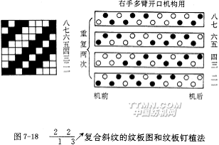 紋板制備是指根據紋板圖的要求在紋板上植紋釘的操作。圖7-18是復合斜紋的紋板圖和紋板釘植法。圖中黑點表示植有紋釘,圓圈表示不植紋釘的孔眼。雖用四塊紋塊即可織造,但因紋板總數至少需8塊,故要重復一個緯紗循環數。