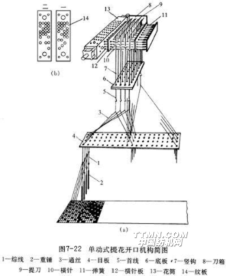 如同多臂開口機構一樣,提花開口機構也由選綜裝置、提綜裝置和回綜裝置組成。根據提綜裝置的提刀往復一次所形成的梭口數,也分成單動式和復動式。提花開口機構控制綜絲,多臂開口機構控制綜框,但兩者的控制原理是一致的。