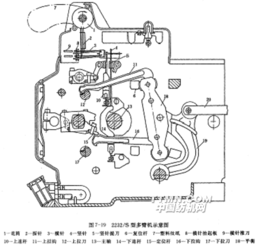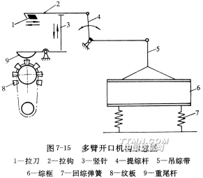 最簡單的多臂開口機構如圖2-14所示。拉刀1由織機主軸上的連桿或凸輪傳動,作水平方向的往復運動。拉鉤2通過提綜桿4、吊綜帶5同綜框6連接。由紋板8、重尾桿9控制的豎針3按照紋板圖所規定的順序上下運動,以決定拉鉤是否為拉刀所拉動,從而決定與該拉鉤連接的綜框是否被提起。7為回綜彈簧。