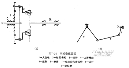 圖7-20是回轉變速裝置的示意圖。大齒輪1固定不動,短軸O由織機側軸通過鏈輪、鏈條傳動,作勻速回轉運動。短軸O帶動連桿5(實際上為一圓盤)通過連桿3使一對行星齒輪2環繞大齒輪1旋轉。行星齒輪2固裝在連桿3一端,連桿另一端與方形滑塊4相連,方形滑塊嵌在滑槽6內,滑槽6又與多臂機主軸O1連成一體。在主軸O1上固裝有偏心輪傳動機構7,通過連桿8傳動提綜臂9。當織機運轉時,通過上述機構使綜框作變速往復運動。該變速運動是行星輪運動與滑塊機構運動復合的結果,可獲得織機主軸轉角100º左右的近似靜止角。