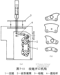 凸輪開口機構的不足之處,其一是只能生產簡單組織的織物,如果織制較為復雜的織物,凸輪外形曲線將變得非常復雜,為減小壓力角,又必須將凸輪基圓直徑放大,以致開口機構變得過分笨重;其次,一定的凸輪外形只能生產一定開口規律的織物品種,為了適應織物品種多變的要求,必須儲備大量的各種開口凸輪,這在實際生產中是不經濟的。事實上,凸輪外形曲線一般由小半徑到大半徑、大半徑到小半徑、大半徑到大半徑和小半徑到小半徑共四種不同弧段拼接而成。如果采用模塊化設計方法,將這四種弧段對應的凸輪部分分列開來,單獨制造,而后將它們按織物組織的要求如同鏈條一樣串聯起來形成紋鏈,即可滿足各種復雜的開口要求。圖7-11(a)是現代無梭織帶機的紋鏈開口機構的簡圖。紋鏈1由圖7-11(b)所示的四種不同形狀(弧段)的鏈塊按開口規律要求串接而成,套裝于齒形滾筒2上,主軸每一回轉,滾筒轉過一塊鏈塊,驅動綜框3完成相應的開口動作。每頁綜框對應一條長度相同的紋鏈,前后頁綜框的紋鏈塊可以互換,綜框動程通過改變提綜桿4的支點位置來調節。紋鏈開口可適應較為復雜的織物組織的織造,緯紗循環長達數十緯,最高可響應1800r/min的織機轉速。