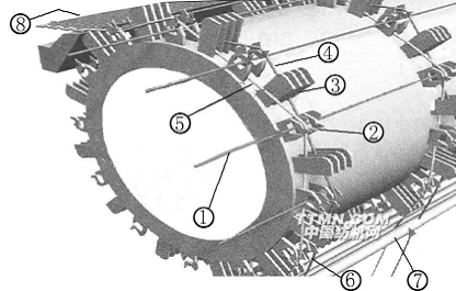 1─緯紗2─開口片3─打緯片4─上層梭口5─下層梭口6─經紗片7─經紗定位桿8─織物