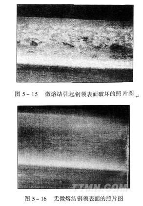 在傳統的鋼領表面,鋼絲圈材料中的微粒會被熔結到鋼領上,由于這個微熔結過程的存在,造成鋼領運轉軌道過早的磨損和破裂(圖5—15、圖5—16),并導致鋼絲圈運作不穩定,紗線出現張力波動,使成紗質量下降,也使鋼絲圈壽命減短。因此,設計和制造耐磨損的鋼領和鋼絲圈對緊密紡工藝而言非常重要。