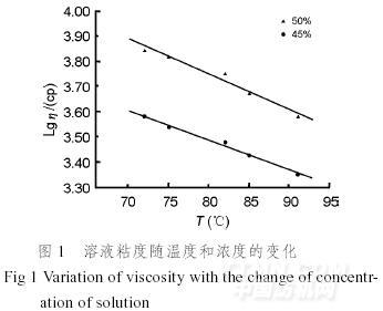 由圖1~2可知,本實驗所配制的紡絲溶液,其粘度隨濃度的增加而增加,隨溫度和表面活性劑加入量的增加而降低。這是因為隨著溶液濃度的增加,蛋白質大分子間的作用力和瞬間網絡結構增加,使得溶液粘度增加。當溫度上升或表面活性劑用量增加時,大分子鏈段的活動能力變大,分子間力減弱,瞬間網絡結構被破壞而導致粘度下降。而且隨著溶液濃度的提高,其粘流活化能增大,粘度受溫度的影響也就越顯著。表明該溶液符合一般高聚物溶液的基本特性和Arrhenius方程式η=A·expEη/RT所表征的規律。式中A為由聚合物種類、分子量、鏈剛性決定的常數,Eη為粘流活化能,T為絕對溫度,R為氣體常數[7]。