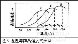 壓燙溫度對剝離強度影響很大,圖5是在一定的壓力和時間下,三種不同襯布的壓燙溫度與剝離強度的關系。