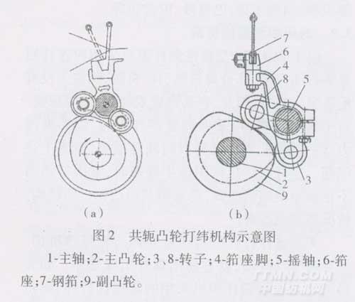凸輪打緯機構可以實現準確的運動規律,打緯時筘座角加速度最大,實現慣性打緯。引緯時筘座靜止不動,從而可以實現筘座分離,減輕筘座重量,減小織機振動。Smit公司生產的Fast型劍桿織機采用在引緯時有靜止時間的凸輪打緯機構。當引緯時,筘座在后面有200°~300°時間的靜止,并采用分離筘座。圖2-a是一種共軛凸輪打緯機構的剖面圖。凸輪從動件直接帶動筘座腳作往復擺動。片梭織機的凸輪打緯機構及C401s型劍桿織機的打緯機構見圖2-b,共軛凸輪的位置處于搖軸的前面,這樣可使前綜盡可能接近鋼筘以減小綜框的動程。在這種凸輪打緯機構中往往用一根鋼管做搖軸,上面安裝著多只輕金屬筘座腳用以固定筘座和鋼筘,使它們形成一牢固的整體,在高速運轉時得以減小振動。尤其是這類凸輪打緯機構在打緯時鋼筘稍向前傾,于是經位置線也隨之而傾斜一小的角度,這也是減小織機縱向深度的措施之一。