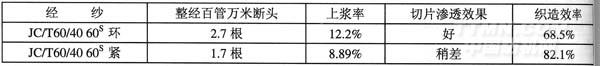 另外為了驗證該裝置生產的緊密紗線的實用效果,我們在Zex-e噴氣織機上試織過JC/T60/4060s×60S173×(59+59)117cm緞條,其結果如下表:(注:緯紗為JC/T60/4060S環)