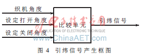 引緯信號由比較單元比較織機(jī)角度和設(shè)定打開角度、設(shè)定關(guān)閉角度而產(chǎn)生,引緯信號產(chǎn)生框圖如圖4所示。當(dāng)引緯信號沒有跨越零度時(shí),即設(shè)定關(guān)閉角度大于設(shè)定打開角度時(shí),引緯信號在織機(jī)角度大于設(shè)定打開角度且小于設(shè)定關(guān)閉角度時(shí)有效;反之,當(dāng)引緯信號跨越零度時(shí),即設(shè)定關(guān)閉角度小于設(shè)定打開角度時(shí),引緯信號在織機(jī)角度大于設(shè)定打開角度或小于設(shè)定關(guān)閉角度時(shí)有效。