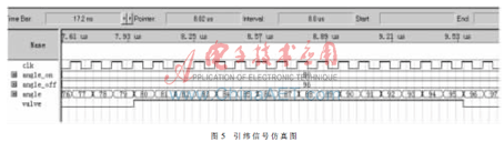FPGA本質上是由硬件組成的,其編程語言也為VHDL等硬件描述語言,它的程序并行執(zhí)行,也就是說一旦主機角度或設定的打開關閉角度有變化,幾十路的引緯信號就會立即同時輸出,誤差僅為信號的建立時間,只有幾納秒。因此FPGA產生的引緯信號可以很好地滿足噴氣織機對引緯控制精度和控制一致性的要求,從根本上改變處理器產生引緯信號的弊端。引緯信號仿真圖如圖5所示:設定打開角度為80°,設定關閉角度為96°,引緯信號在這個區(qū)間內有效。由圖5可以看出,引緯信號的產生和關閉幾乎沒有任何延時。