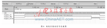 在FPGA中雖然沒有單穩(wěn)態(tài)電路,但是可以采用時鐘計數(shù)的方式來模擬單穩(wěn)態(tài)的產生:在信號的上升沿開始計數(shù)并設置單穩(wěn)態(tài)信號有效,計滿8ms的時鐘脈沖個數(shù)后停止計數(shù)并設置單穩(wěn)態(tài)信號無效,這樣就可以輸出精確的8ms單穩(wěn)態(tài)信號。例如,假設采用8k的計數(shù)時鐘頻率,64個計數(shù)時鐘周期就是8ms,單穩(wěn)態(tài)信號的誤差不會超過0.125ms,高低壓驅動信號仿真圖如圖6所示,其中signal_8ms為8ms單穩(wěn)態(tài)驅動信號,signal_hold為低壓驅動信號。