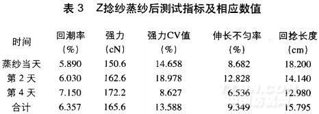 具體工藝優選試驗如下:蒸紗工藝參數:抽真空8min,達到指定真空度0.08MPa,溫度95~110℃,高溫高壓蒸紗J20min,蒸紗后取紗樣測試數據見表2和表3。