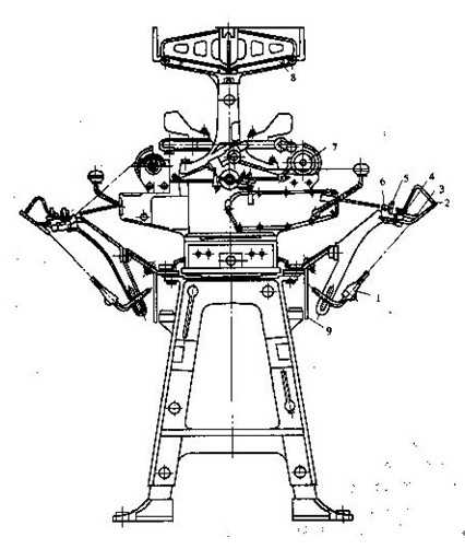 1332型槽筒式絡筒機的工藝過程如圖8—2—1所示。紗線自管紗(線)1退繞下來,經導紗桿2引入導紗板凳,再經過圓盤張力器和清紗板5的縫隙以及張力桿6引入槽筒7的溝槽。由于槽筒摩擦傳動筒子回轉和溝槽的往復導紗運動,從而使紗線交叉地卷繞在筒子上。