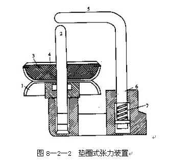 墊圈式張力裝置如圖8—2—2所示,由兩片圓盤形張力盤1和芯軸2所組成,在上張力盤內裝有毛氈墊圈3和張力墊圈4。紗線在上下兩片張力盤之間通過時,由于張力盤與紗線的摩擦作用,上張力盤及張力墊圈隨著紗線的前進而回轉,紗線上落下的塵屑被拋出,同時由于摩擦阻力而使紗線具有一定的張力。毛氈墊圈的作用是吸收上張力盤和張力墊圈在高速轉動時的震動,使紗線張力均勻,從而得到良好的成形。
