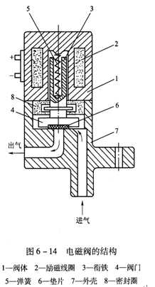圖6—14為一種電磁閥的結(jié)構(gòu),勵(lì)磁線圈2通電時(shí),銜鐵3在電磁引力的作用下上升,閥門(mén)4和墊片6被提升,氣路開(kāi)通,噴嘴開(kāi)始噴射氣流;勵(lì)磁線圈2斷電后,銜鐵3在彈簧5的作用下復(fù)位,閥門(mén)關(guān)閉,從而關(guān)斷氣路。