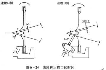 在實際運轉的織機上,經紗存在著動態張力,且紗線表面的毛羽會造成粘連現象,使開口過程中經紗離開筘槽的實際時間延遲。因此,按上述方法確定緯紗最早進梭口時間時,上、下層經紗應分別離開筘槽的上、下唇至少5mm,如圖6—24所示。當閉口過程的上層經紗再次運動到距筘槽的上唇3m