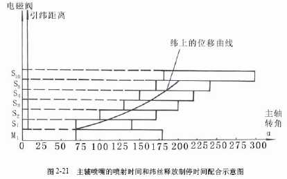 儲氣筒2穩定供氣壓力,在規定的時間提供給主噴嘴、輔助噴嘴、吸緯噴嘴等需要壓縮空氣工作的裝置。噴氣引緯的供氣系統如圖2-20所示。